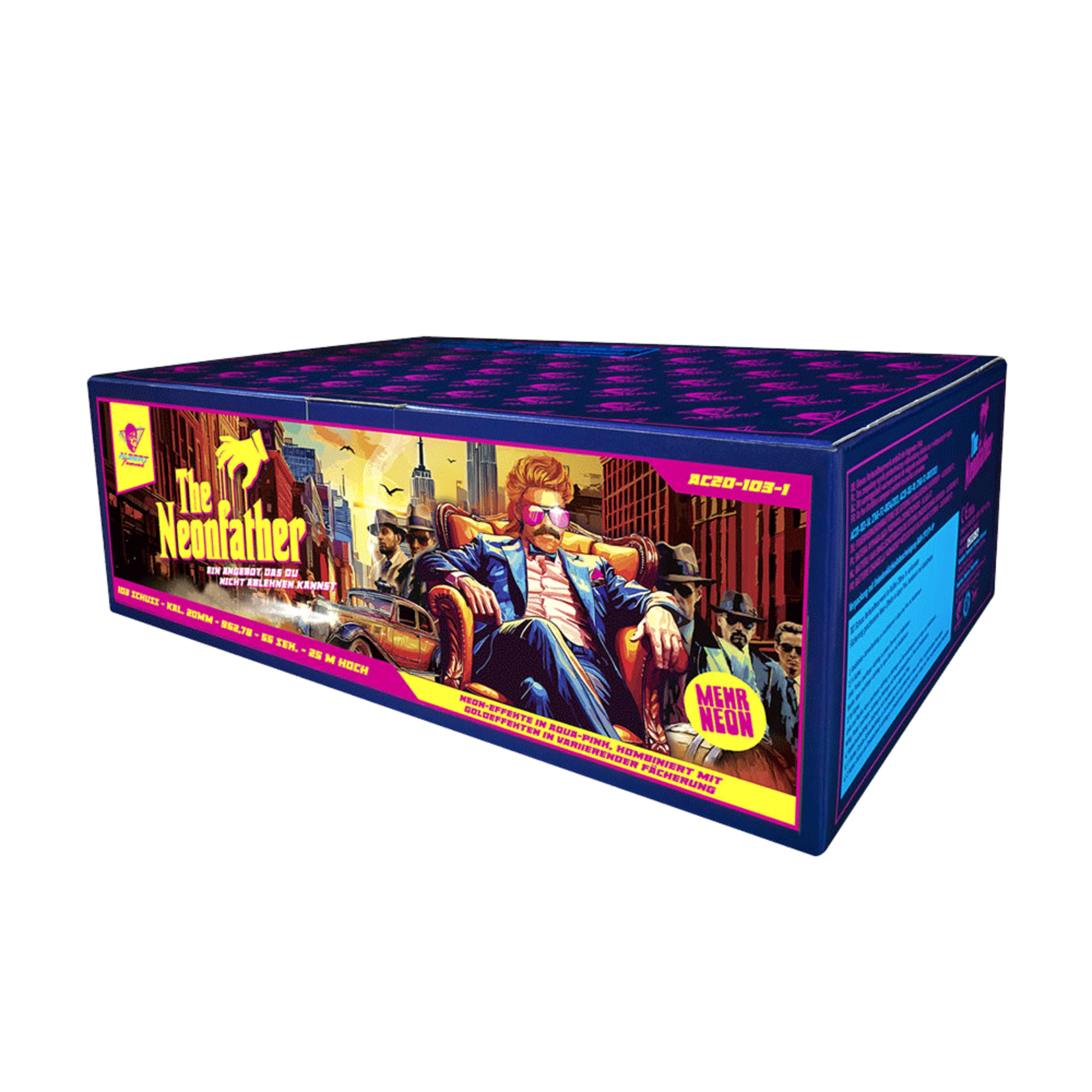 103 Schuss Verbundfeuerwerk im Kaliber 20mm. In variierender Fächerung geschossene Neon-Effekte in Aqua-Pink, kombiniert mit Goldeffekten.